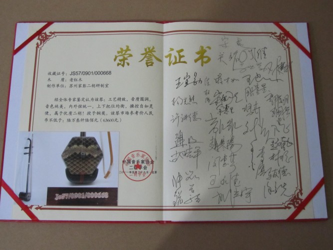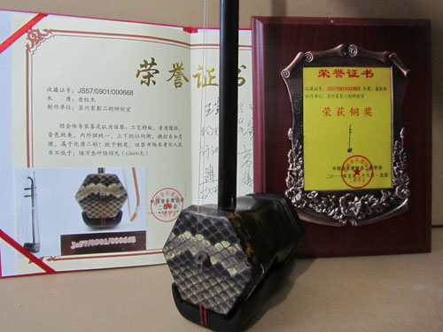 二胡制作大師丁家彭先生1949年出生樂器世家,17歲隨其祖父學(xué)琴藝,并深得精髓,其聰穎好學(xué),悉心鉆研與 探求二胡制作,博得同行的欽佩贊許,更得了許多知名演奏家的稱贊,充分認識到二胡制作每個環(huán)節(jié),都對二胡制作都有影響力,因此對二胡的選材,選料,蟒皮都十分嚴格,二胡整體穩(wěn)定性良好,環(huán)境干擾影響極小。